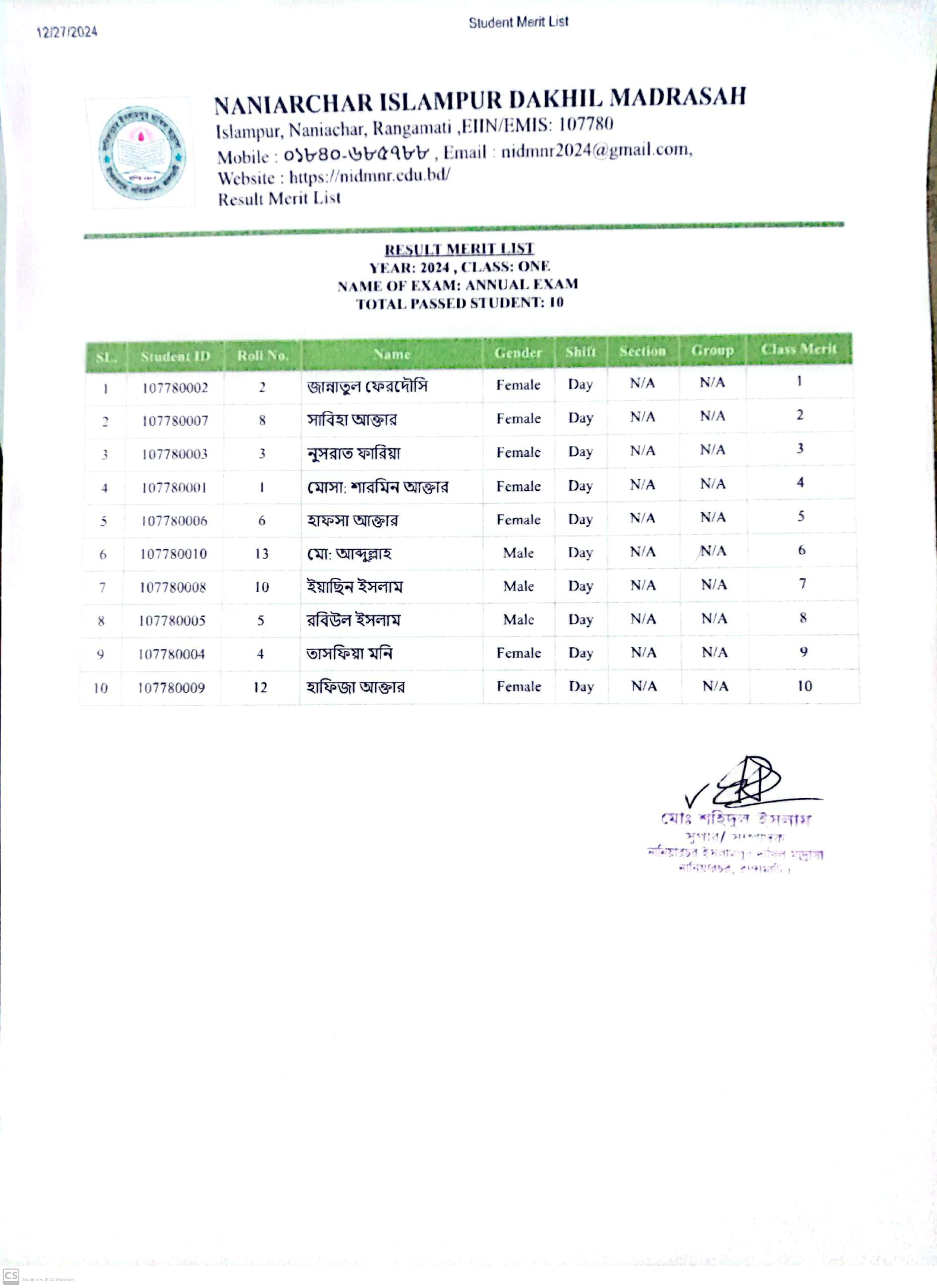 বার্ষিক পরিক্ষার ফলাফল ১ম শ্রেণি |