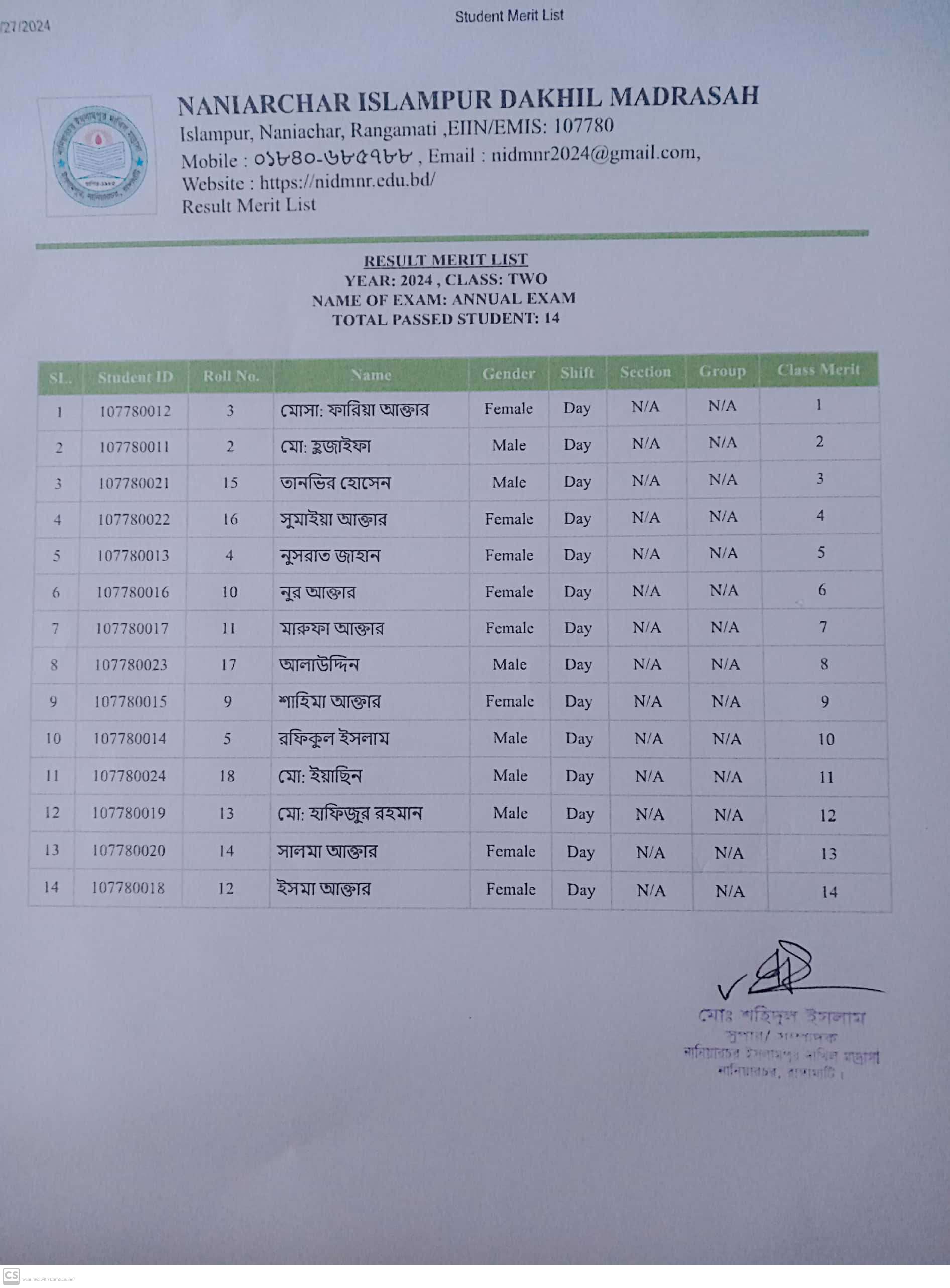 বার্ষিক পরিক্ষার ফলাফল ২য় শ্রেণি |