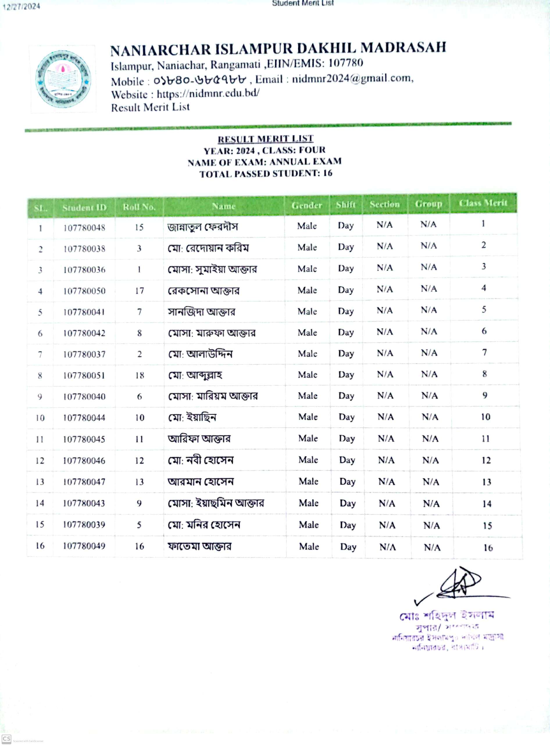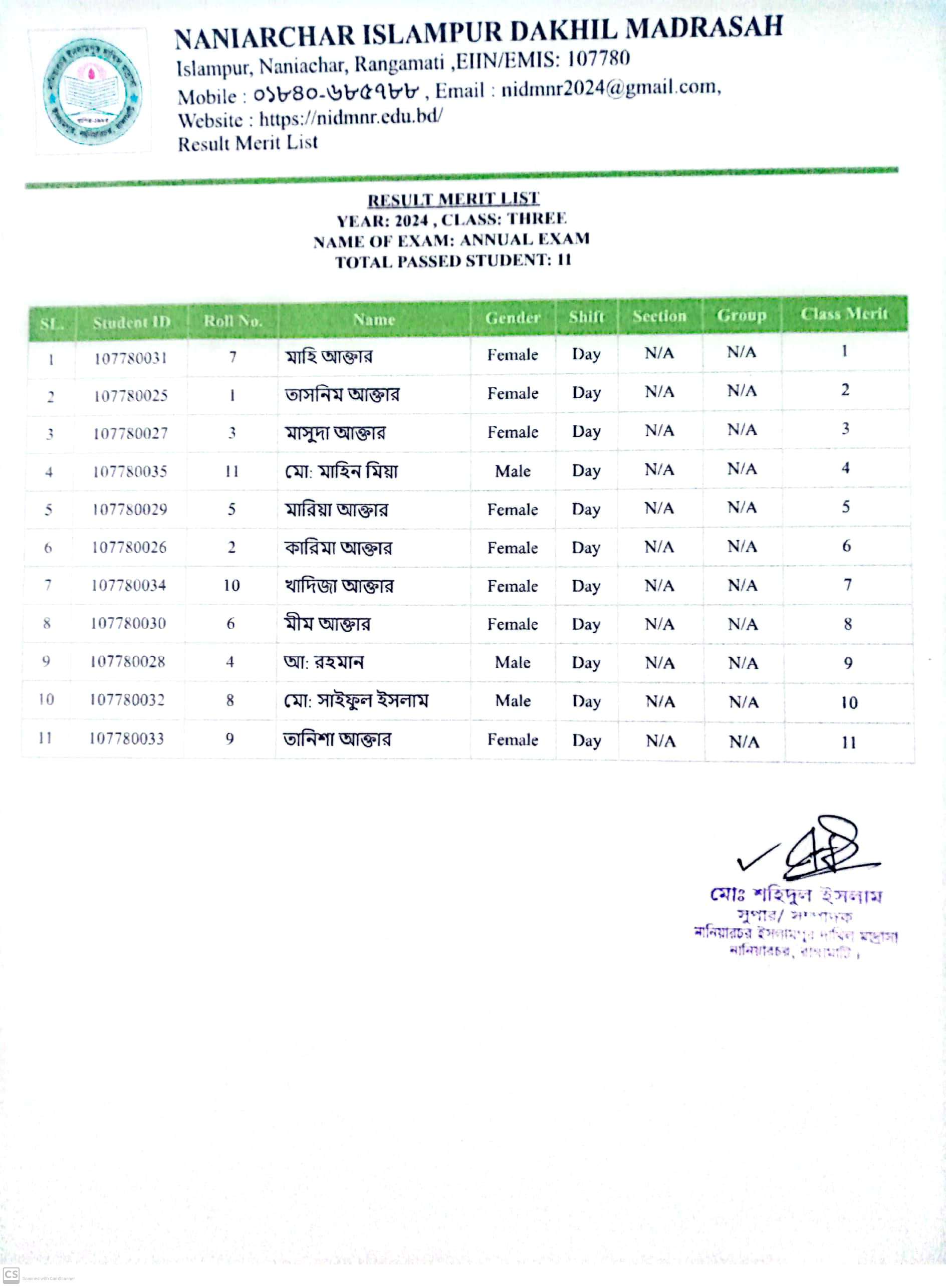 বার্ষিক পরিক্ষার ফলাফল ৭ম শ্রেণি |