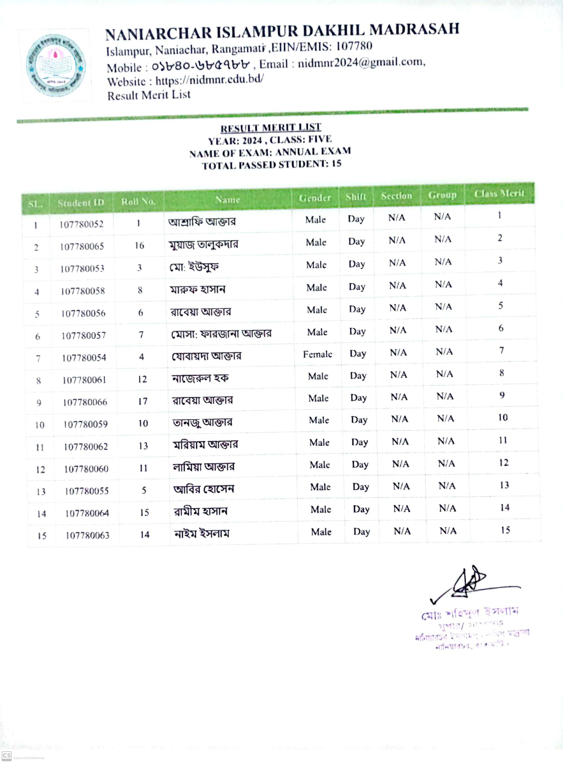 বার্ষিক পরিক্ষার ফলাফল ৫মশ্রেণি |