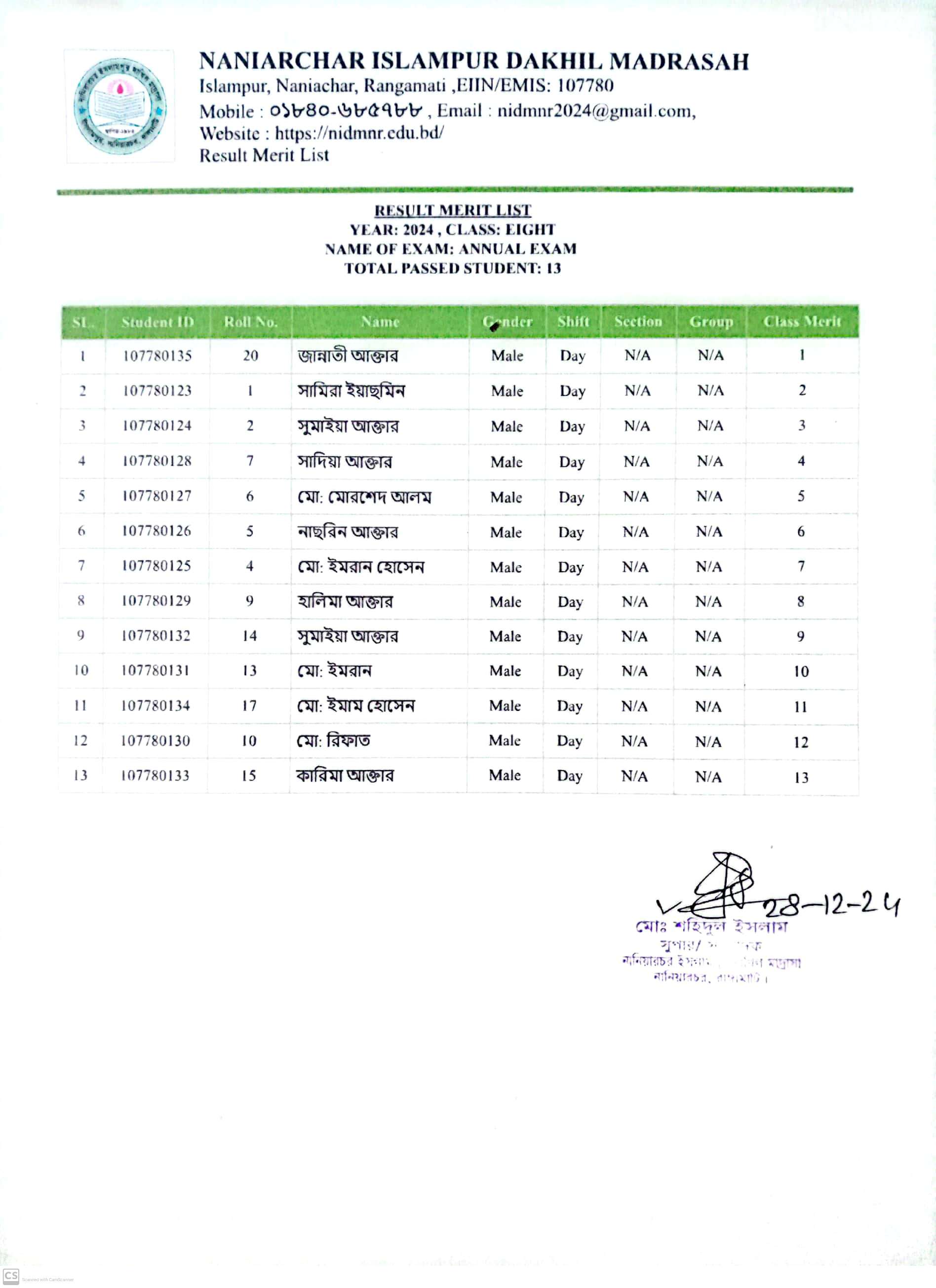 বার্ষিক পরিক্ষার ফলাফল ৮ম শ্রেণি |