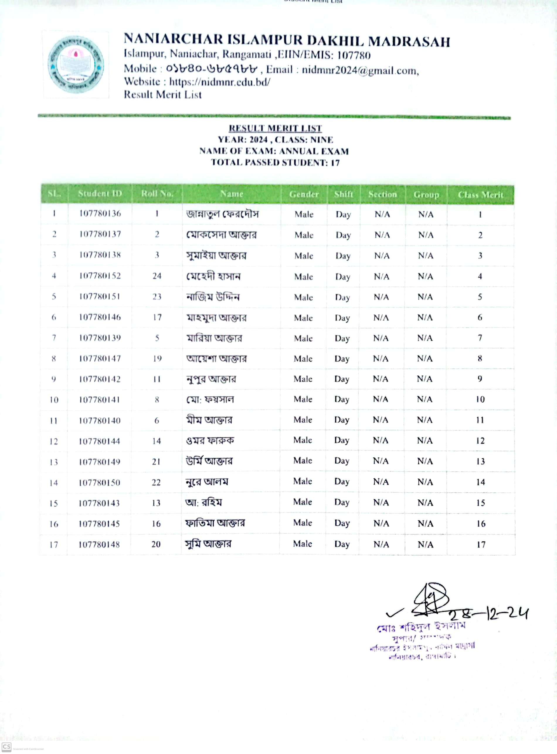 বার্ষিক পরিক্ষার ফলাফল ৯ম শ্রেণি |
