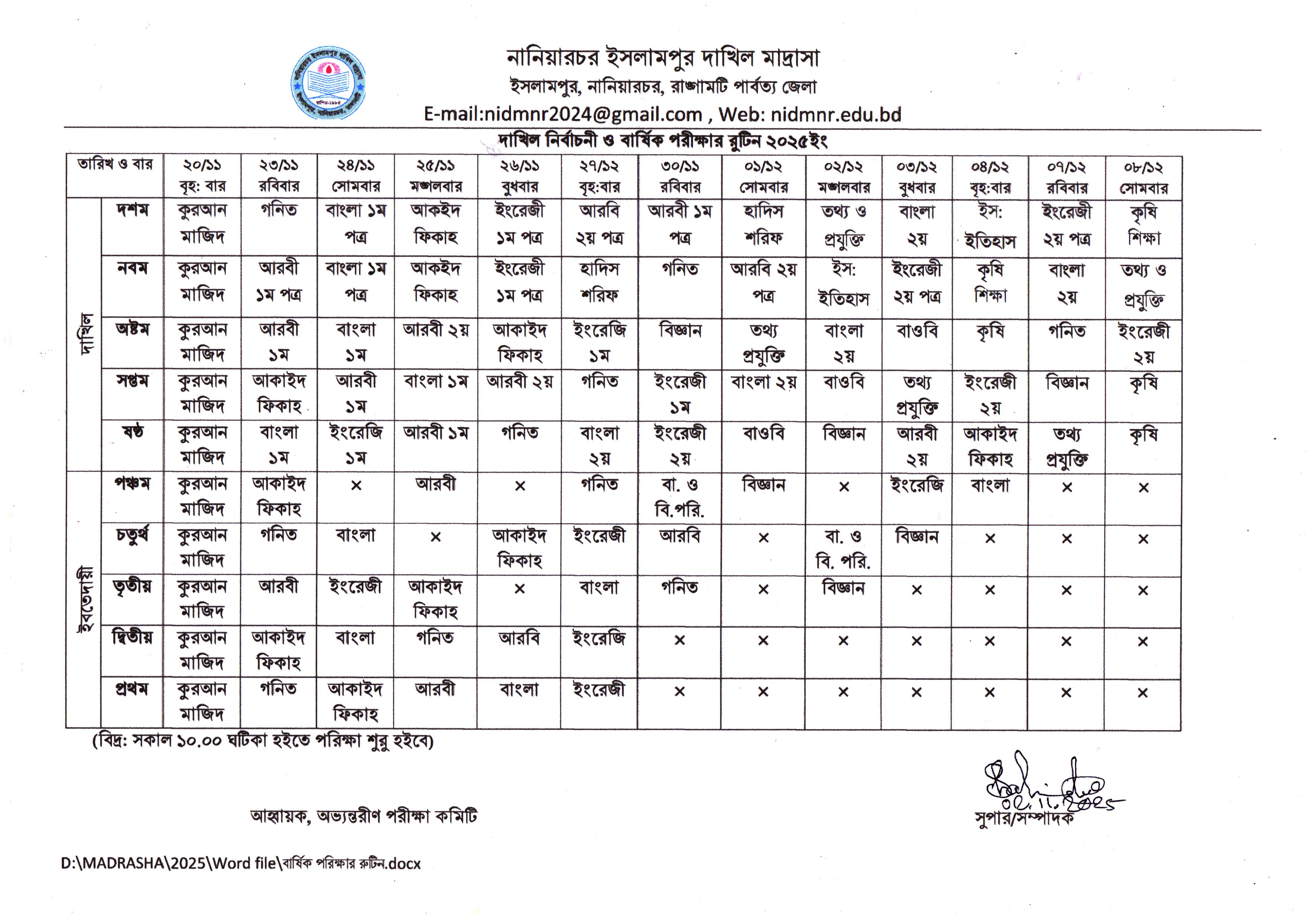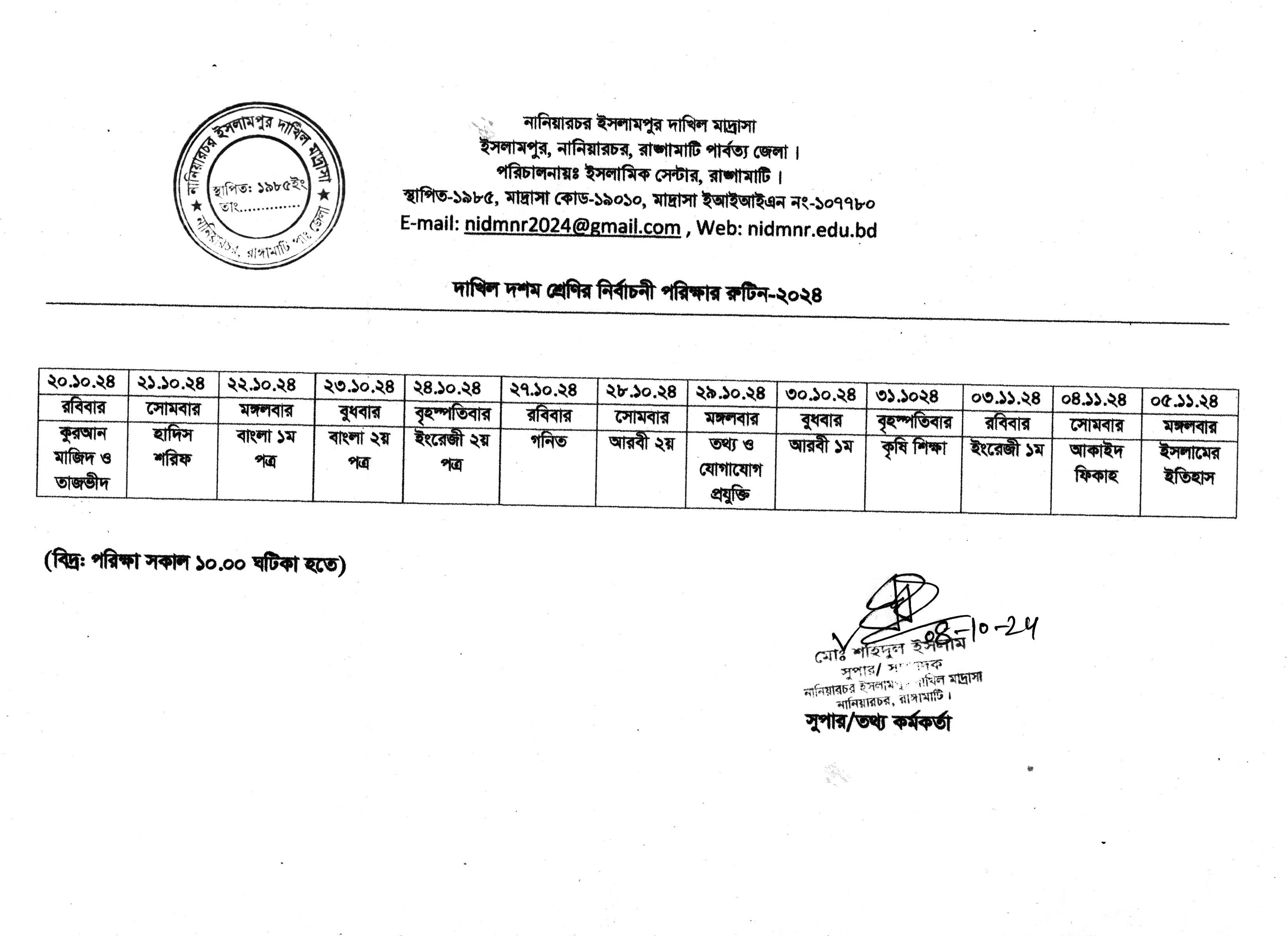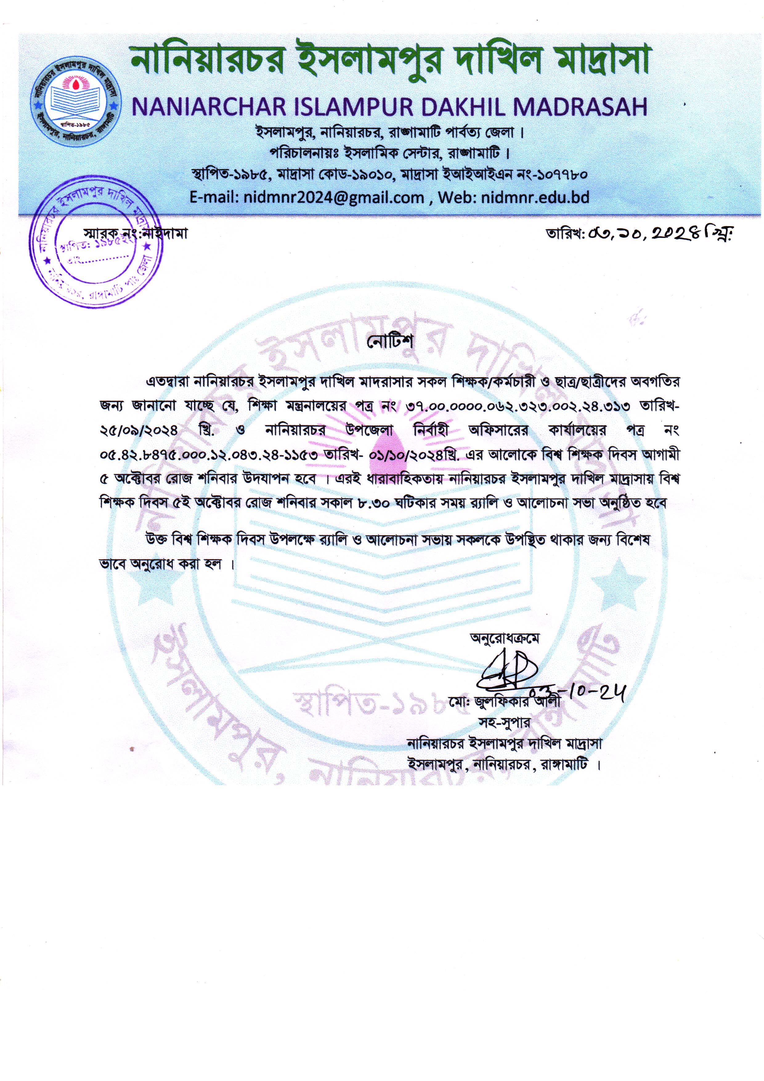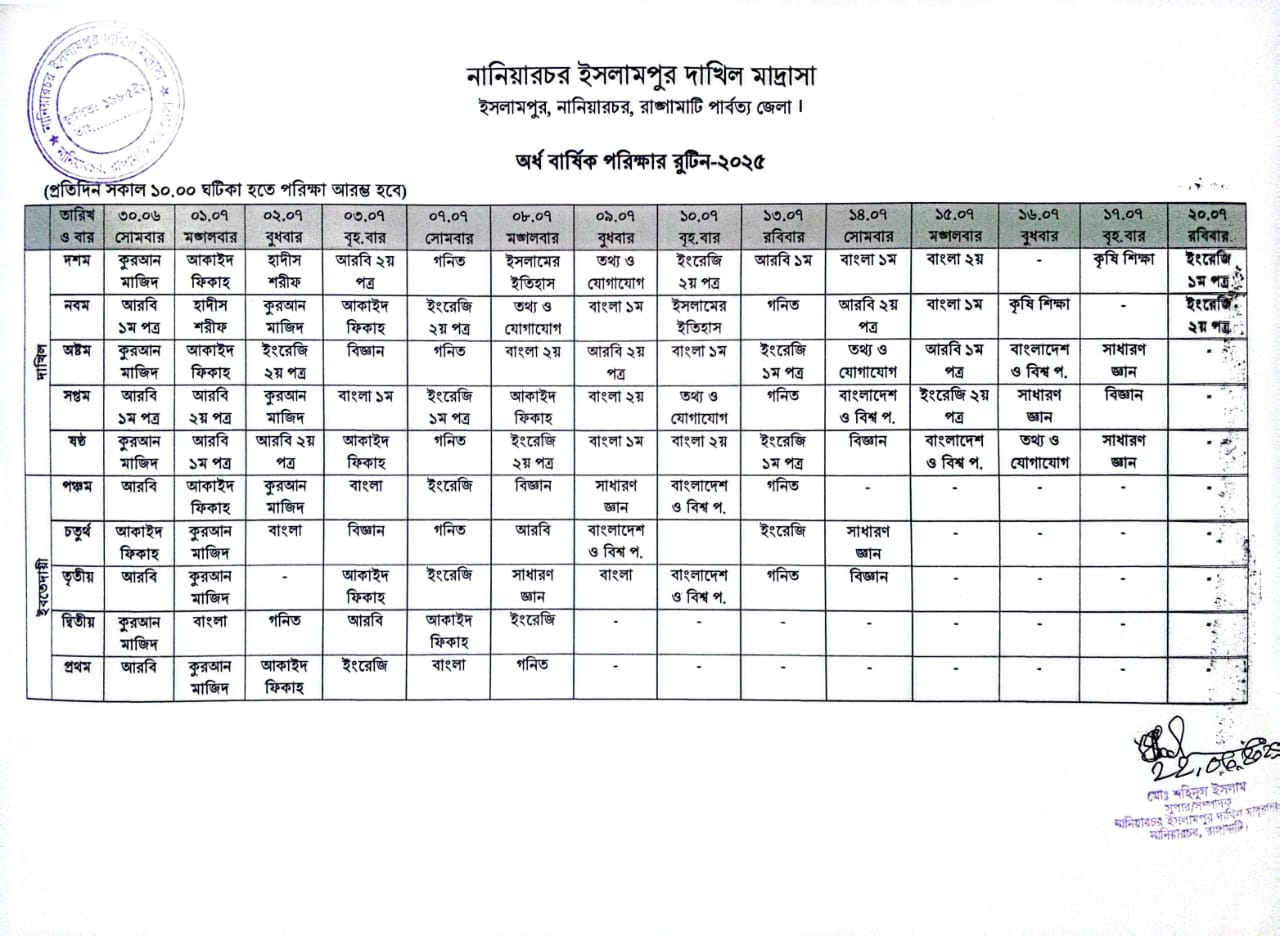 ৩০ জুন ২০২৫ ইং সকাল ১০.০০ ঘটিকা হতে নানিয়ারচর ইসলামপুর দাখিল মাদ্রাসার অর্ধ বার্ষিক পরিক্ষা আরম্ভ হবে । নির্ধারিত সময়ের ৩০ মিনিট পূর্বে পরিক্ষা কেন্দ্রে উপস্থিত থাকার জন্য বলা হল ।